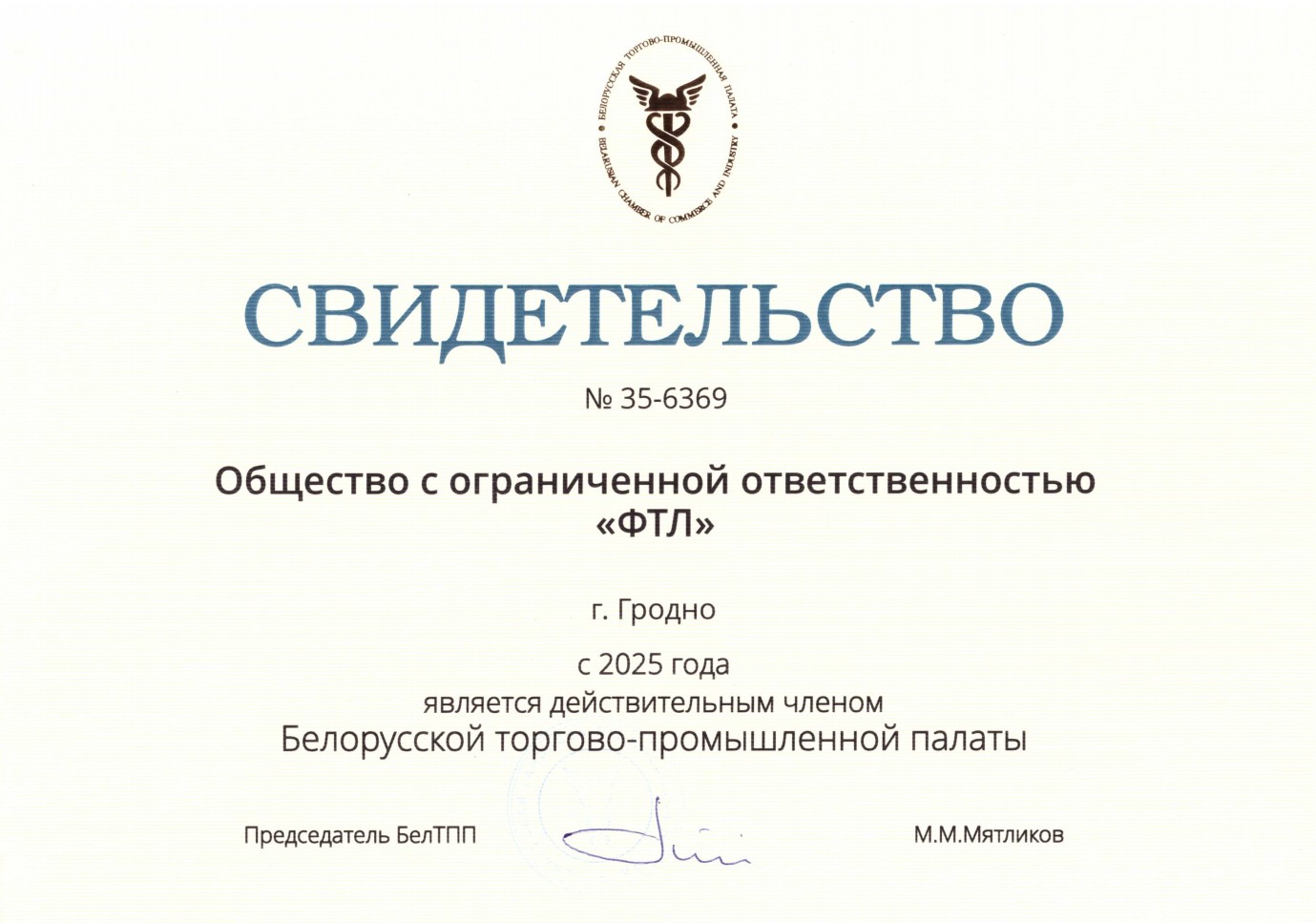 Компания является обладателем свидетельства о членстве в БелТПП, что подтверждает наш профессиональный статус и соответствие международным стандартам ведения внешнеэкономической деятельности.